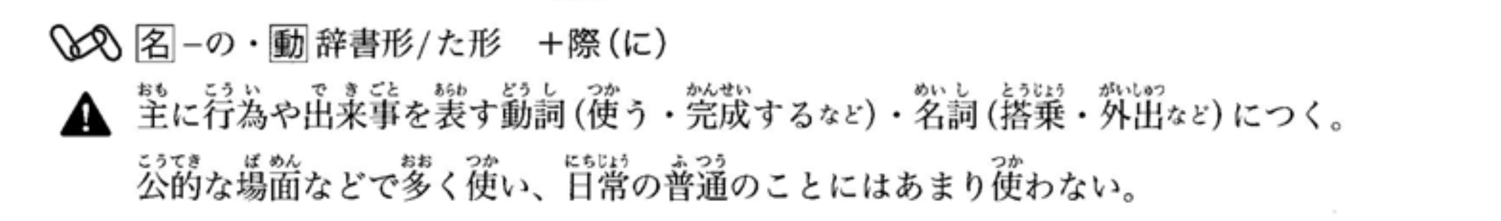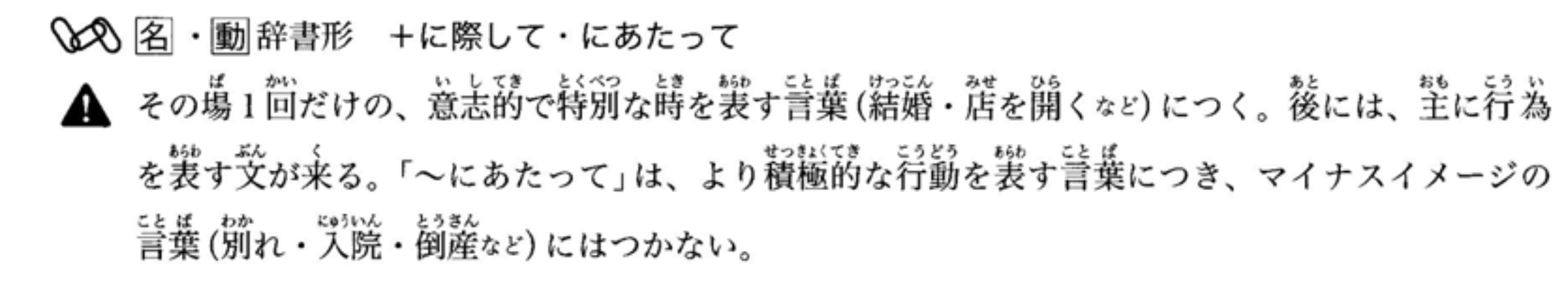 用于表示一次性的、具有意志性和特殊时刻的词语(如‘结婚’、‘开店’等)。后面主要接表示行为的句子。‘~にあたって’主要用于表示积极行动的词语,不能用于带有负面意义的词语(如‘分别’、‘住院’、‘倒闭’等)。