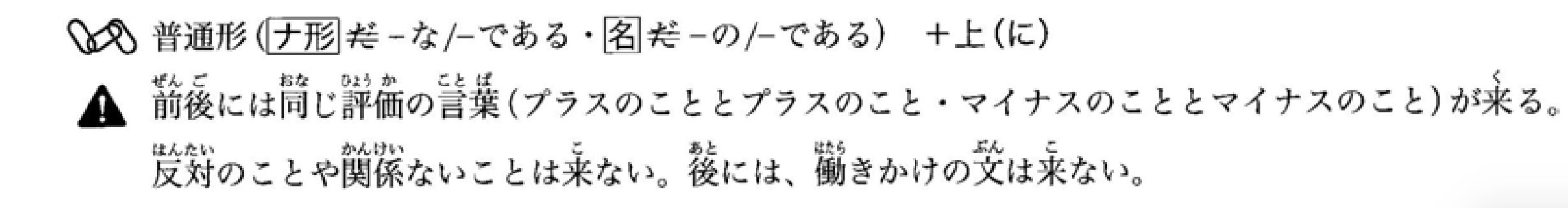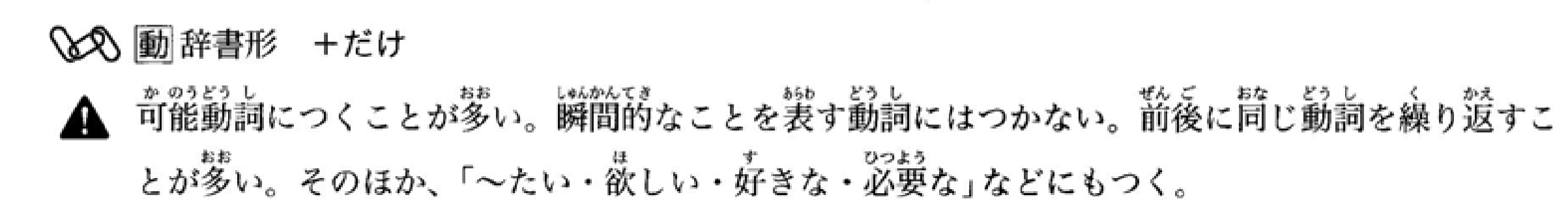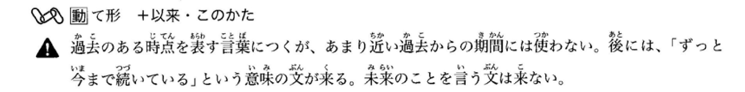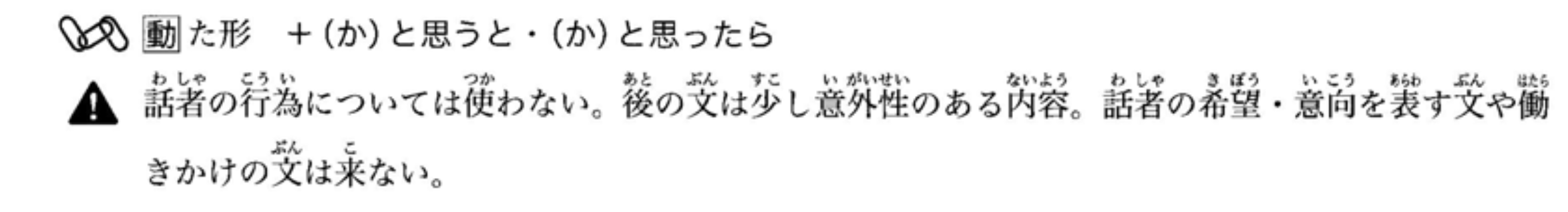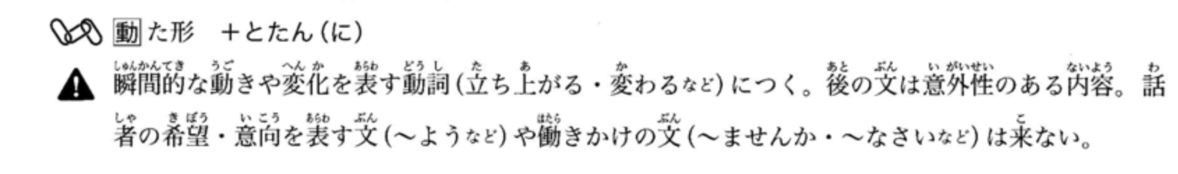 接表示瞬间动作或变化的动词(如‘站起来’、‘改变’等)。后面的句子通常包含意外的内容。不能用于表达说话者的愿望或意图的句子(如‘~よう’等),也不能用于请求或命令句(如‘~ませんか’、‘~なさい’等)。