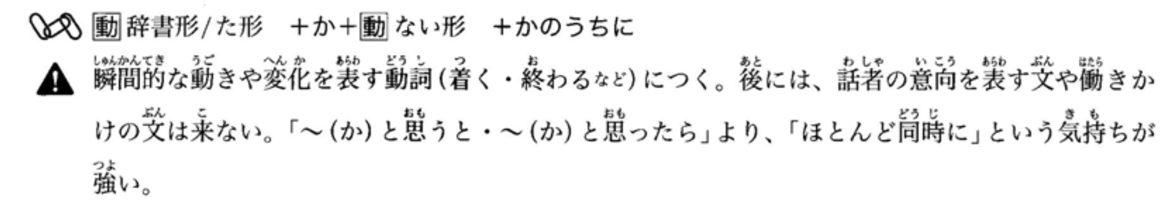 接在表示瞬间动作或变化的动词(如‘到达’、‘结束’等)后面。后面不能接表示说话者意图的句子或请求他人行动的句子。与‘~(か)と思うと’或‘~(か)と思ったら’相比,这种表达更强调‘几乎同时’的感觉。