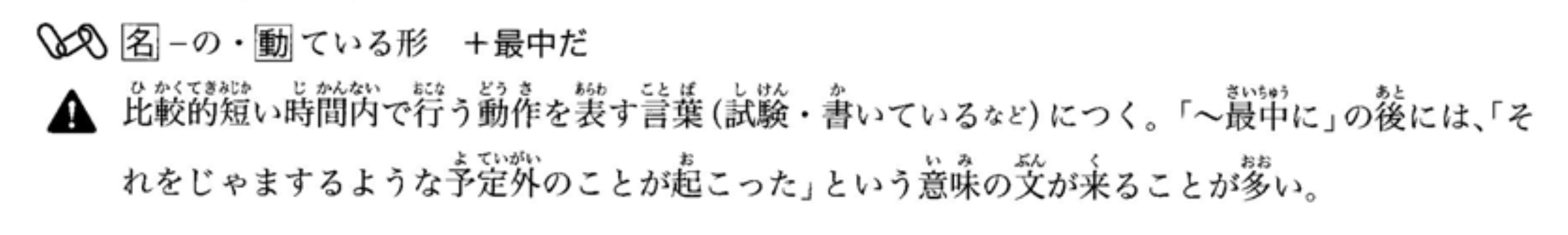 接在表示相对较短时间内进行的动作(如‘考试’、‘正在写’等)的词后面。‘~最中に’之后通常会接表达‘发生了打扰该动作的意外情况’的句子。