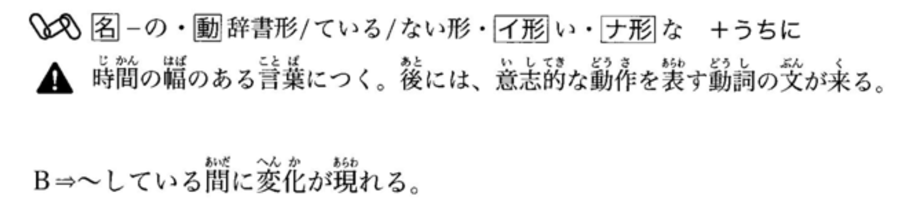 接在表示有时间跨度的词语之后。后面通常接没有意志介入的句子或表示变化的句子。