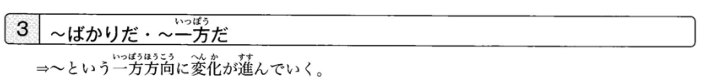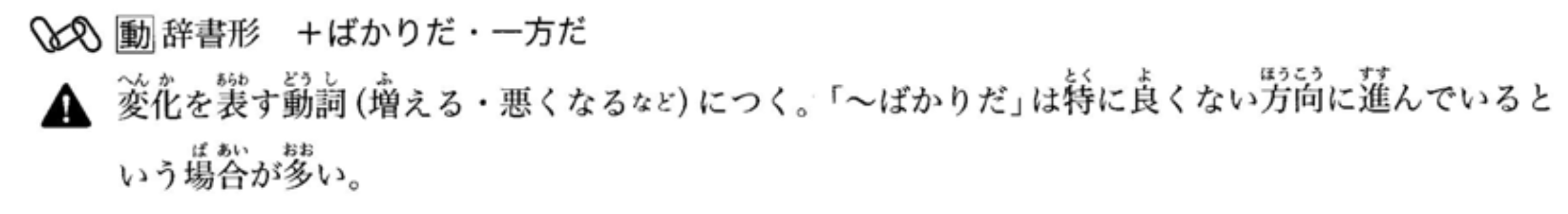 接在表示变化的动词(如‘增加’、‘变坏’等)之后。‘~ばかりだ’多用于表示事情朝着不好的方向发展。