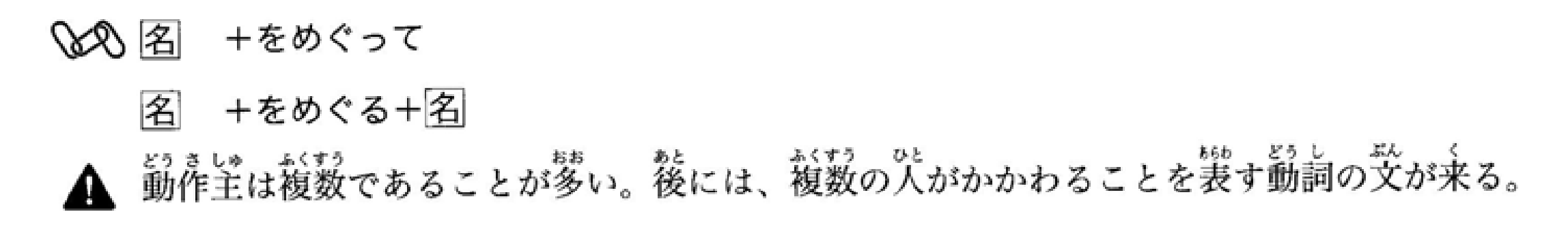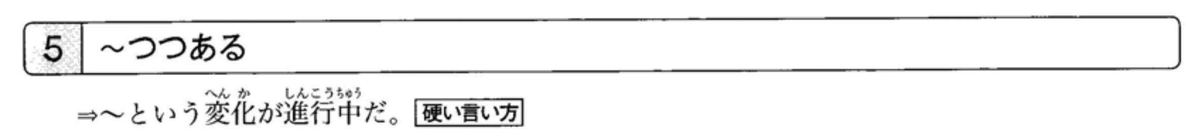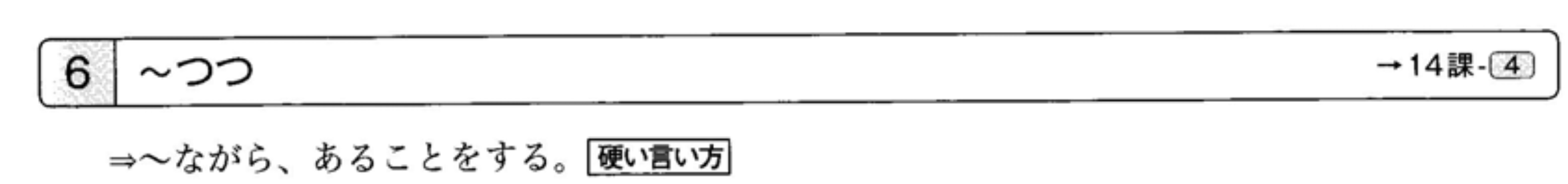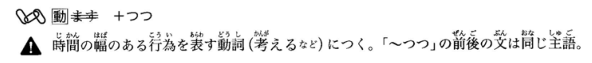 接在表示具有时间跨度的行为动词(如‘思考’等)之后。‘~つつ’的前后句必须具有相同的主语。