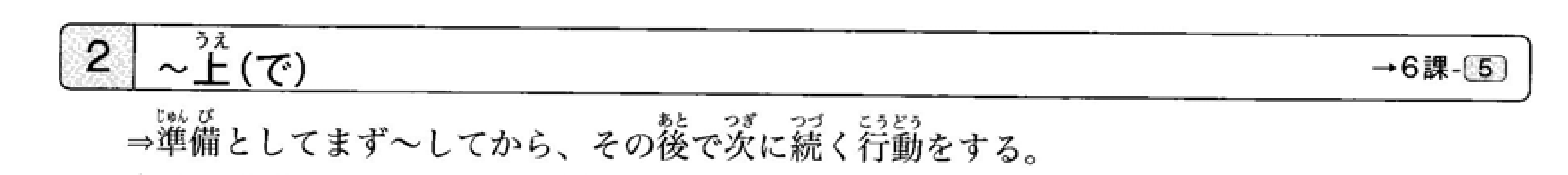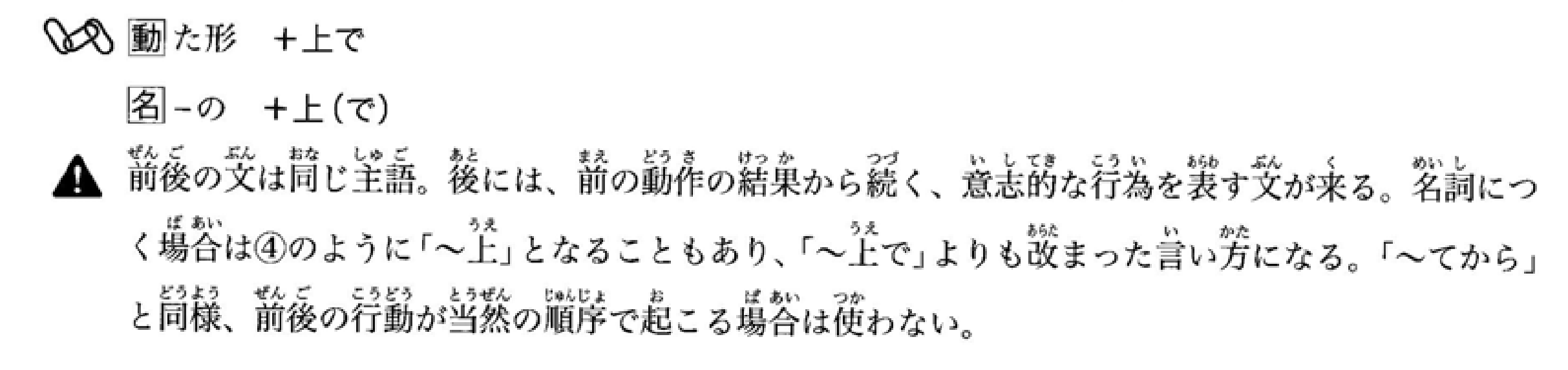 “前后句的主语相同。后句通常是基于前一个动作结果的、有意图的行为。如果接在名词后面,如例④所示,形式会变成『~上』,比『~上で』更加正式。与『~てから』相同,不能用于前后动作按自然顺序发生的情况。”