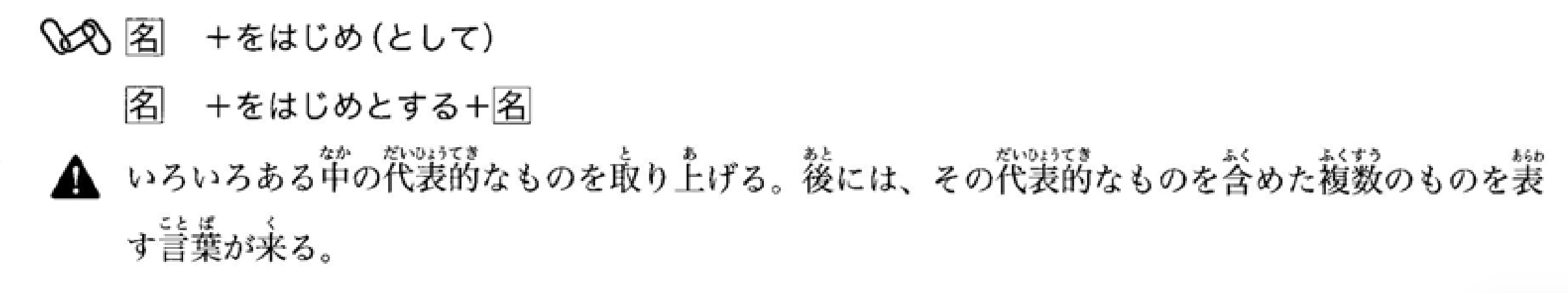 从各种事物中选出具有代表性的事物。后面通常接表示包含该代表性事物在内的多个事物的词语。