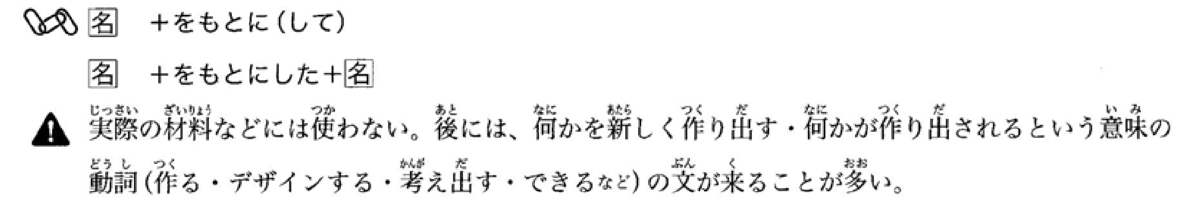 不用于实际的材料。后面通常接表示创造出某物或某物被创造出来的动词(如‘制作’、‘设计’、‘想出’、‘形成’等)的句子。