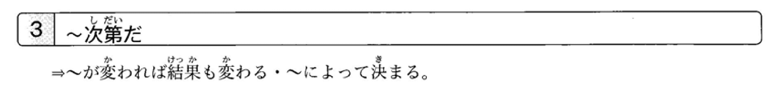 接在具有各种差异或范围的词语后面。后面通常接表示根据‘~’的变化而改变(如增减)或决定的句子。‘~次第では’的后面通常接表示在各种变化中的一种可能性(如增加、失败等)的句子。