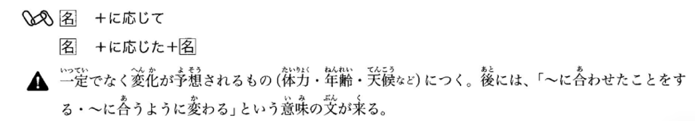 接在预期会发生变化的事物后面(如体力、年龄、天气等)。后面通常接表示‘根据~调整’或‘为了适应~而变化’的句子。