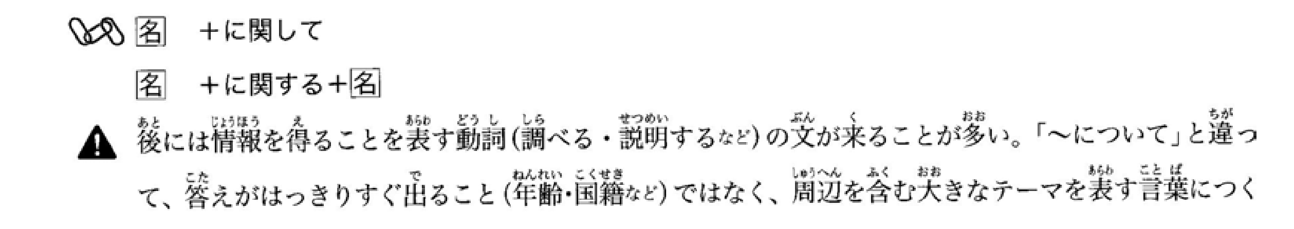 后面通常接表示获取信息的动词句子(如‘调查’、‘说明’等)。与‘~について’不同,‘~に関して’不用于立即能得出明确答案的情况(如年龄、国籍等),而是用于表示包含周边信息的更大主题。