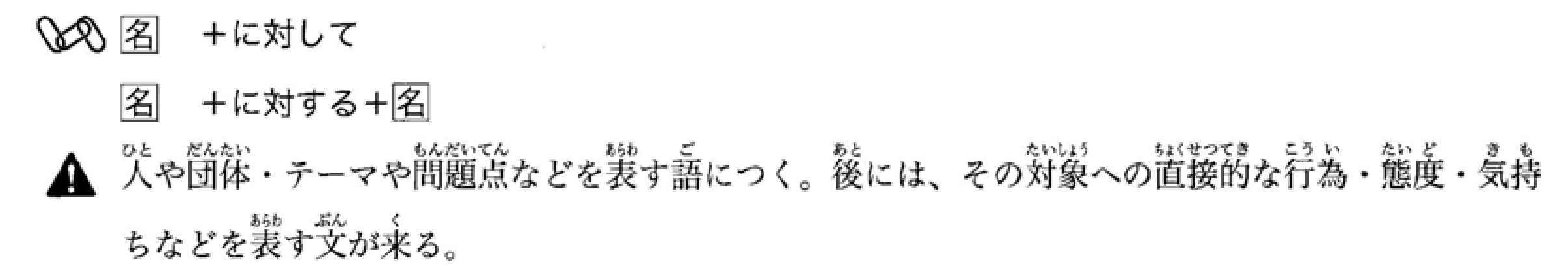 接在表示人物或团体、主题或问题点等词语后面。后面通常接表示对该对象的直接行为、态度或情感的句子。