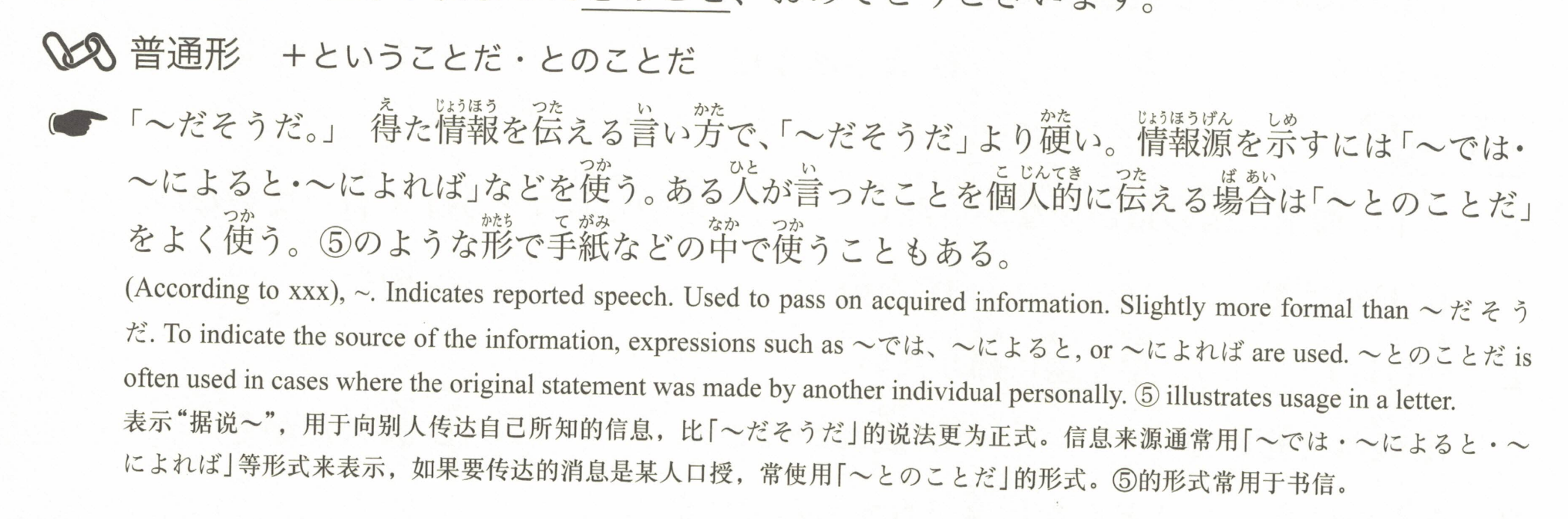 「~だそうだ。」是一种传达获得信息的表达方式,比「~だそうだ」更正式。要表明信息来源时,可以使用「~では・~によると・~によれば」等表达。如果是个人传达某人所说的话,常用「~とのことだ」。在⑤中提到的形式也可以在信件等书面中使用。