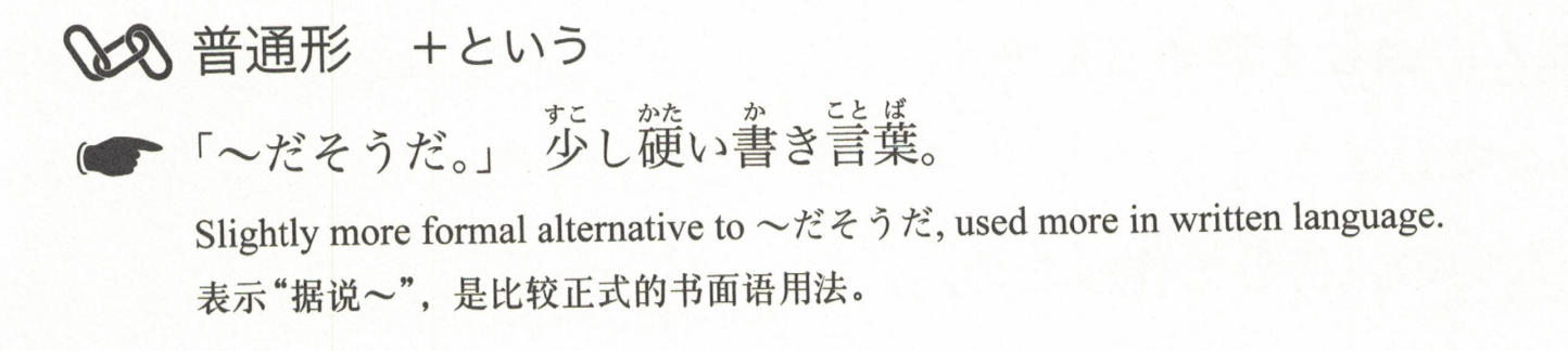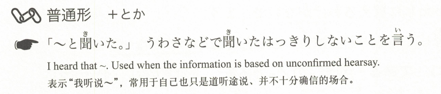 「~,是听说的。」用来表达从传闻等途径得知的不太确定的信息。