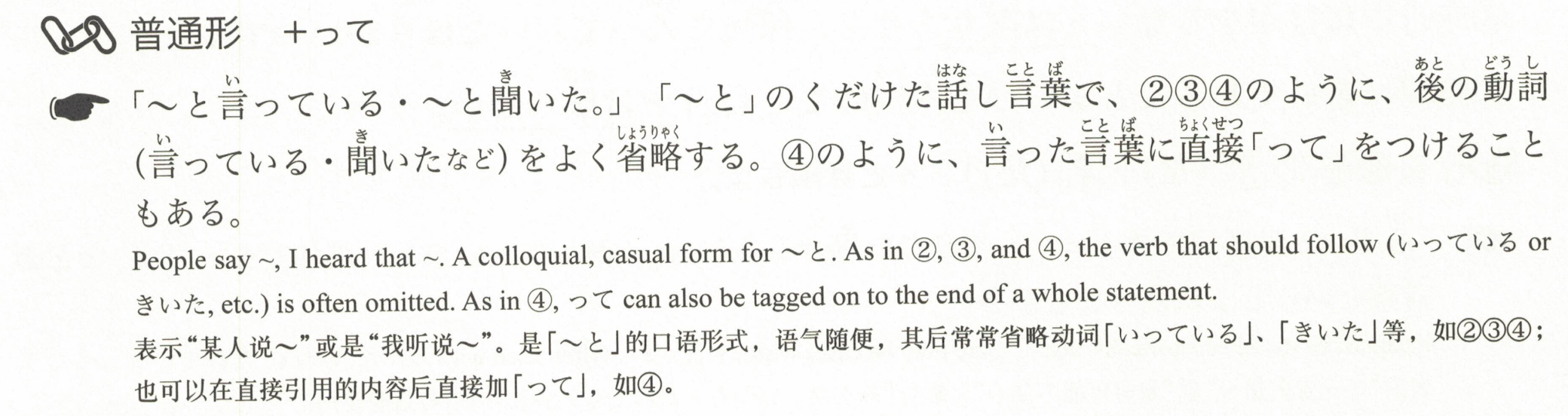 「~と言っている・~と聞いた。」是「~と」的口语形式,像在②③④中,后面的动词(如「言っている」「聞いた」等)经常被省略。在④中,直接在所说的话后面加上「って」也是常见的用法。