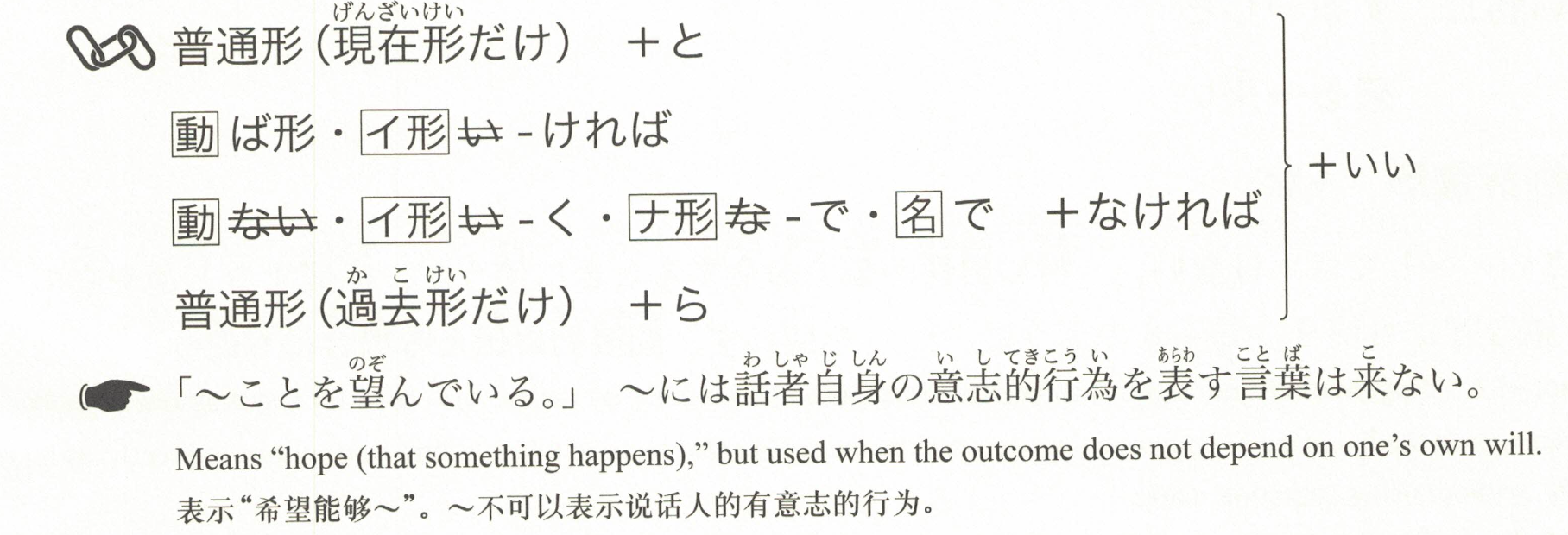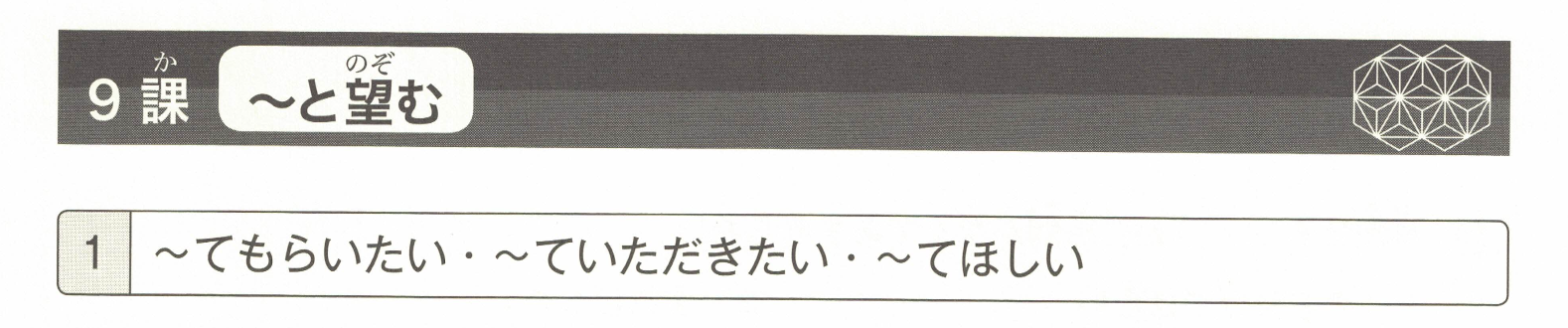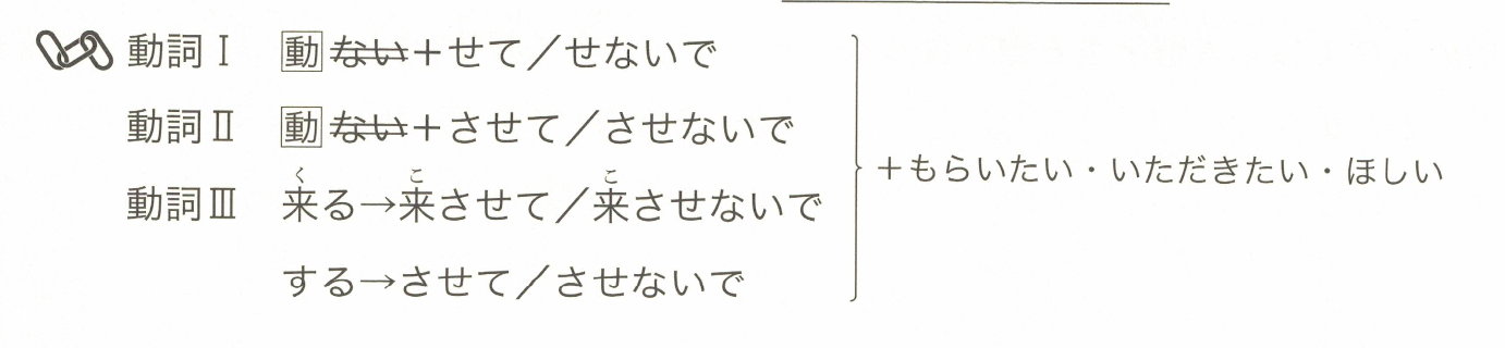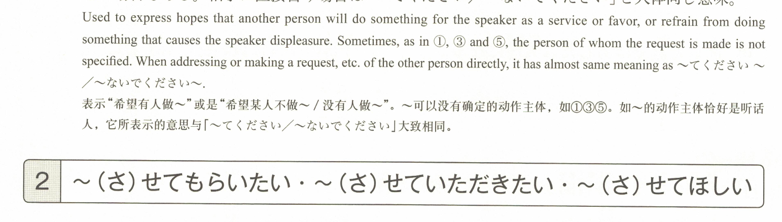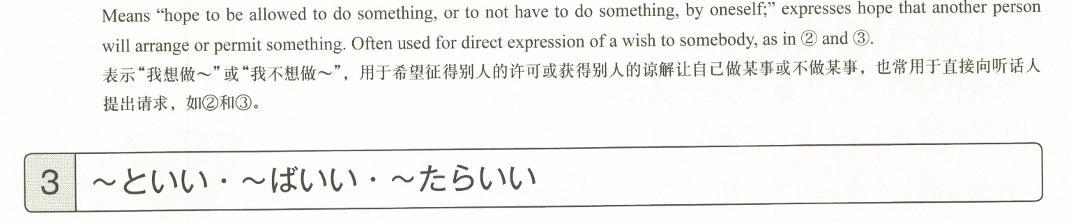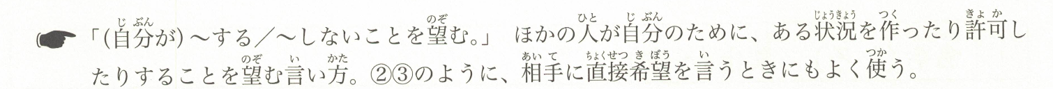 「希望(自己)~做/不做某事。」用于表达希望他人为自己创造某种状况或给予许可的说法。像在②③中,常用于直接向对方表达自己的愿望。