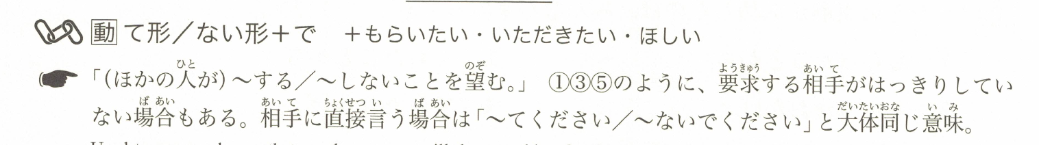 「希望(其他人)~做/不做某事。」在①③⑤的情况下,要求对象可能并不明确。直接对对方说时,意思基本等同于「~てください」或「~ないでください」。