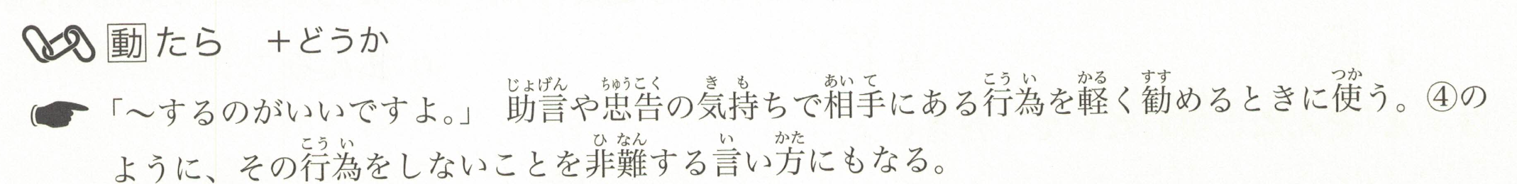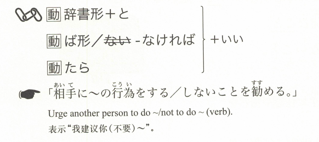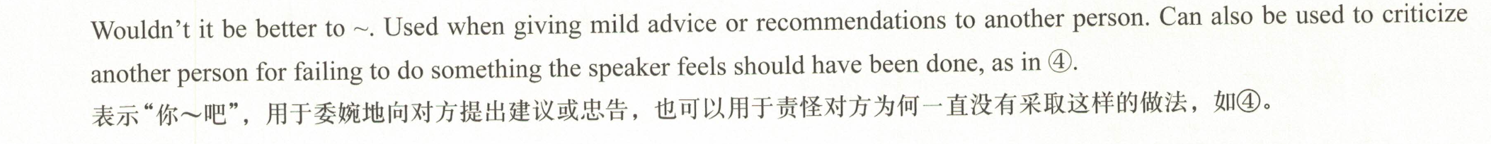 「~做是好的哦。」用于在建议或忠告的语气下轻轻地劝对方做某件事。像④中那样,也可以用于责备对方没有做某件事的表达方式。