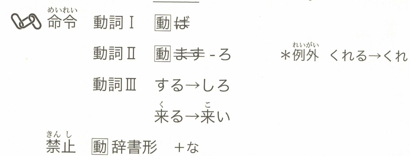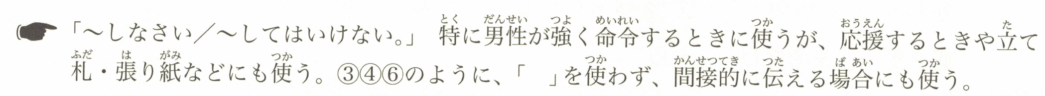 「~去做/不要做~。」通常用于男性在强烈命令时使用,但也用于加油打气或公告、告示等场合。在像③④⑥这样的情况下,即使不使用引号,也可以间接传达指令。