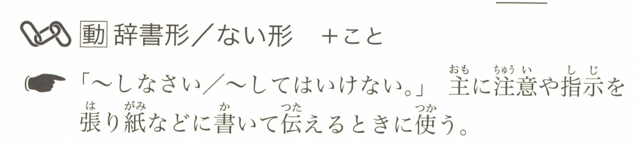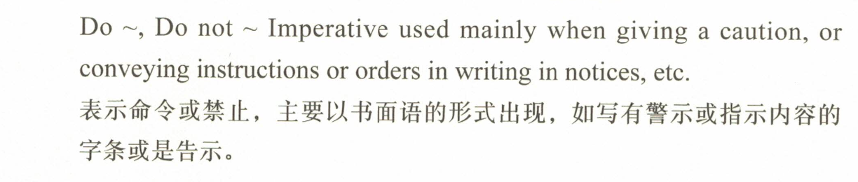 「~去做/不要做~。」主要用于在警告或指示中,写在告示或公告等上面进行传达。