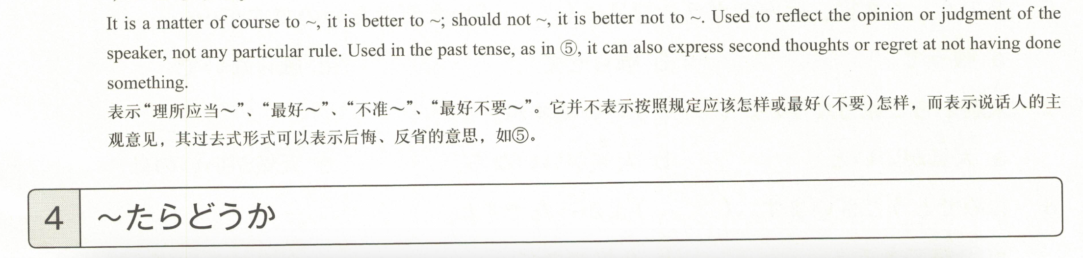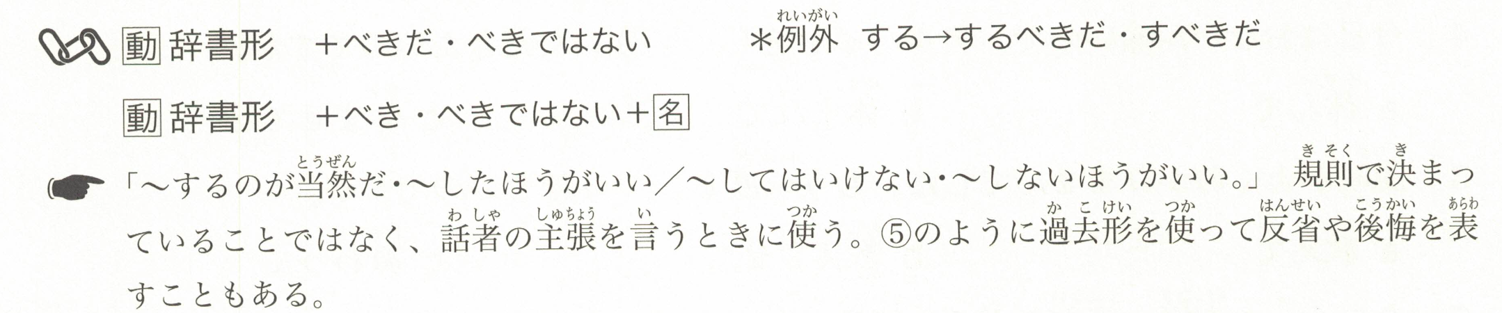 「~是理所当然的・最好~/不应该~・最好不要~。」用于表达说话者的主张,而不是规定的事情。像⑤中那样,使用过去式也可以表达反省或后悔。