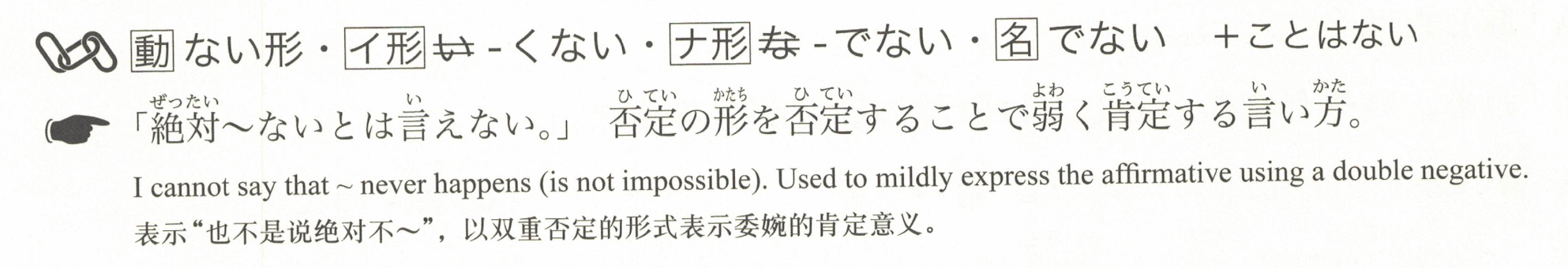 「不能说绝对不~。」通过否定否定形式来表达弱肯定的说法。