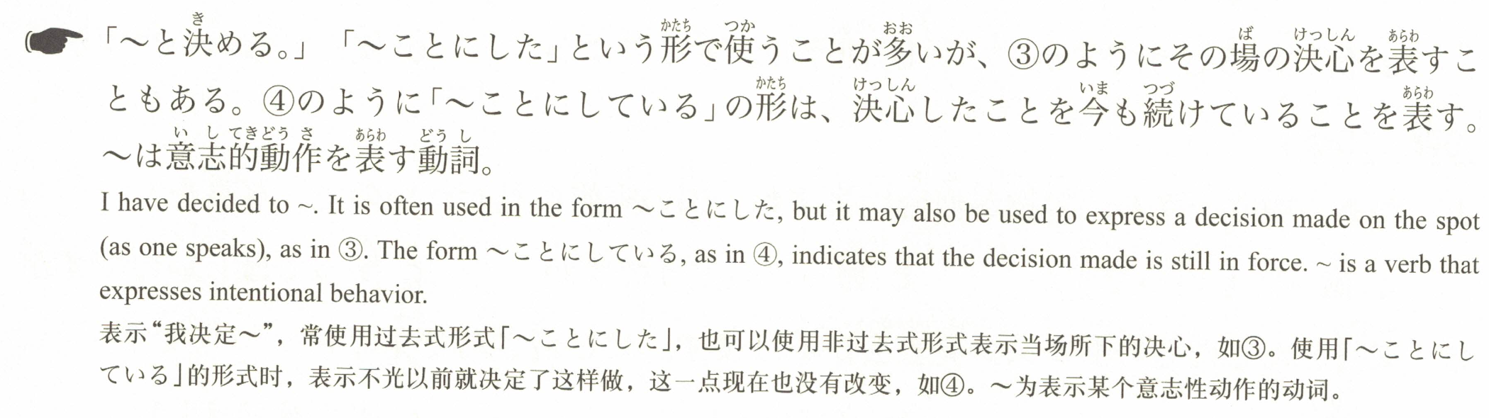 「~と决定。」通常以「~ことにした」的形式使用,但也可以像③那样用于表达当场的决心。像④中的「~ことにしている」形式则表示之前下定的决心现在仍在坚持。~是表示有意志的动作的动词。