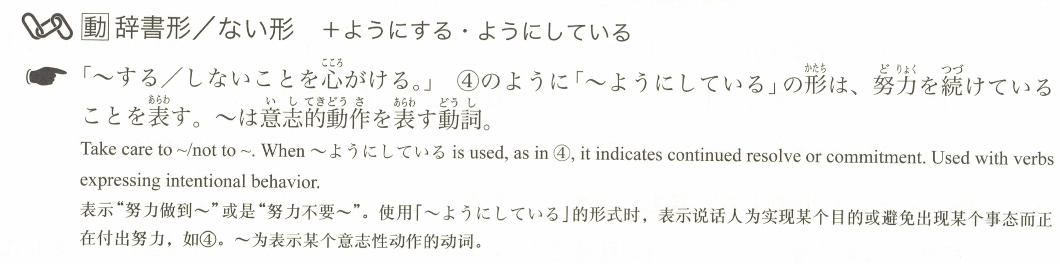 「努力做到/不做~。」像④中的「~ようにしている」形式表示持续在努力。~是表示有意志的动作的动词。
