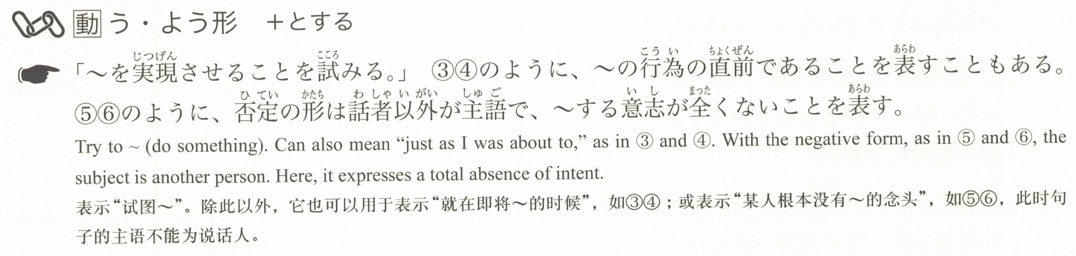 「尝试实现~。」像③④那样,有时也用来表示即将进行~的行为。像⑤⑥中的否定形式,主语通常不是说话者,表示完全没有~的意愿。