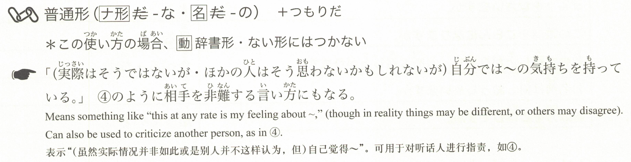「(实际上并非如此,或者别人可能不这么认为)但自己心里却有~的感觉。」像④那样,也可以用于责备对方的表达方式。
