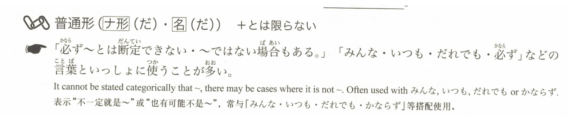 「不能断定一定~・也有不是~的情况。」常与「みんな(大家)・いつも(总是)・だれでも(任何人)・必ず(一定)」等词语一起使用。